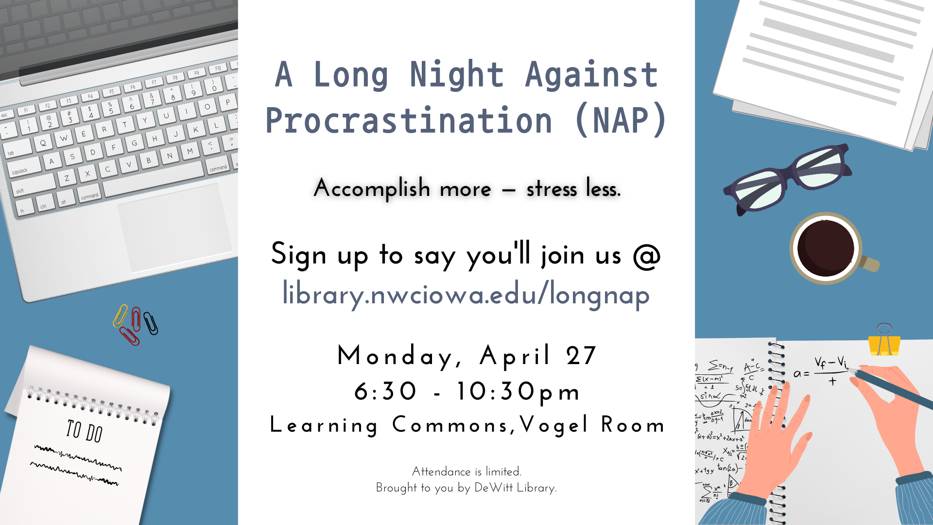 Having trouble focusing on studying? Long Night Against Procrastination (Long NAP) has you covered. On Monday, April 27 from 6:30–11:00pm, the Vogel Room turns into a “study hall”—quiet, focused, and perfect for knocking out those end-of-year projects. Plus, there will be treats, pizza, and prizes to keep you going.